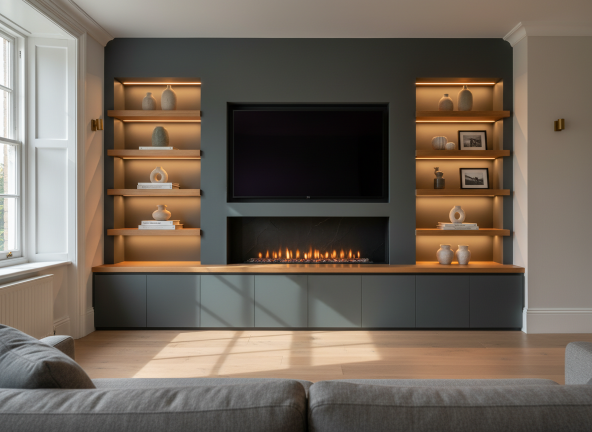 Statement media walls with integrated lighting, cable management and bespoke cabinetry — the centrepiece your living room deserves.